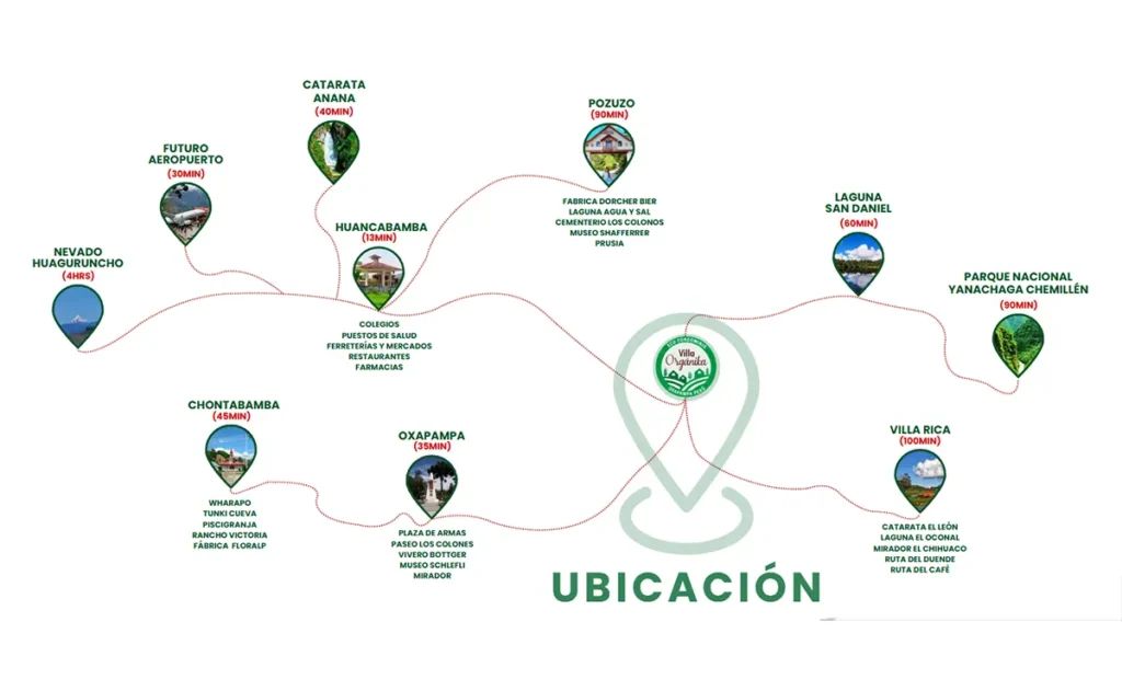 Ubicados en el sector San Daniel a 35 min de la Plaza central de Oxapampa y a 13min del Centro de Huancabamba a 2 Horas de la Merced y a 9 Horas de Lima, a 30 minutos del futuro Aeropuerto de Oxapampa y a 4 horas del actual Aeropuerto de Jauja.